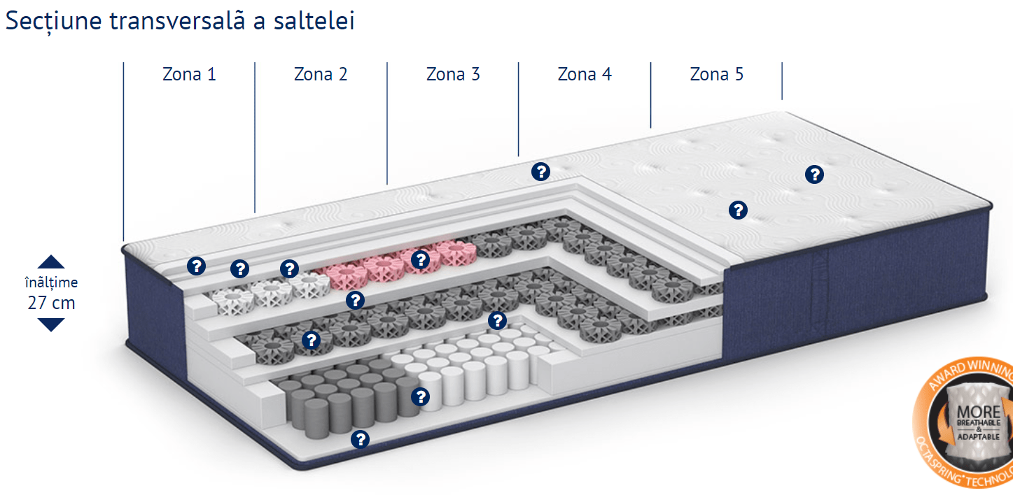 Salteaua are manere laterale pentru a putea fi ridicata, intoarsa si aranjata cu usurinta pe pat. Salteaua are o inaltime de 27 cm, fapt care o face extrem de comoda, avand un design deosebit. Peste arcurile Octaspring® premiate se află un strat gros de spumă cu memorie, totul pe o fundație formată dintr-o sută de buzunărașe arcuite pentru o distribuire uniformă a greutății. Toace aceste straturi au un rol foarte bine definit in a oferi comfortul de zi cu zi, cu o fermitate ce poate fi reglata de la tare la mediu. Aerul circula rapid la interior, astfel incat salteaua sa isi recapete formele de dinainte, chiar si dupa 15 ani de utilizare, conform testelor efectuate in laborator de specialistii din domeniu.